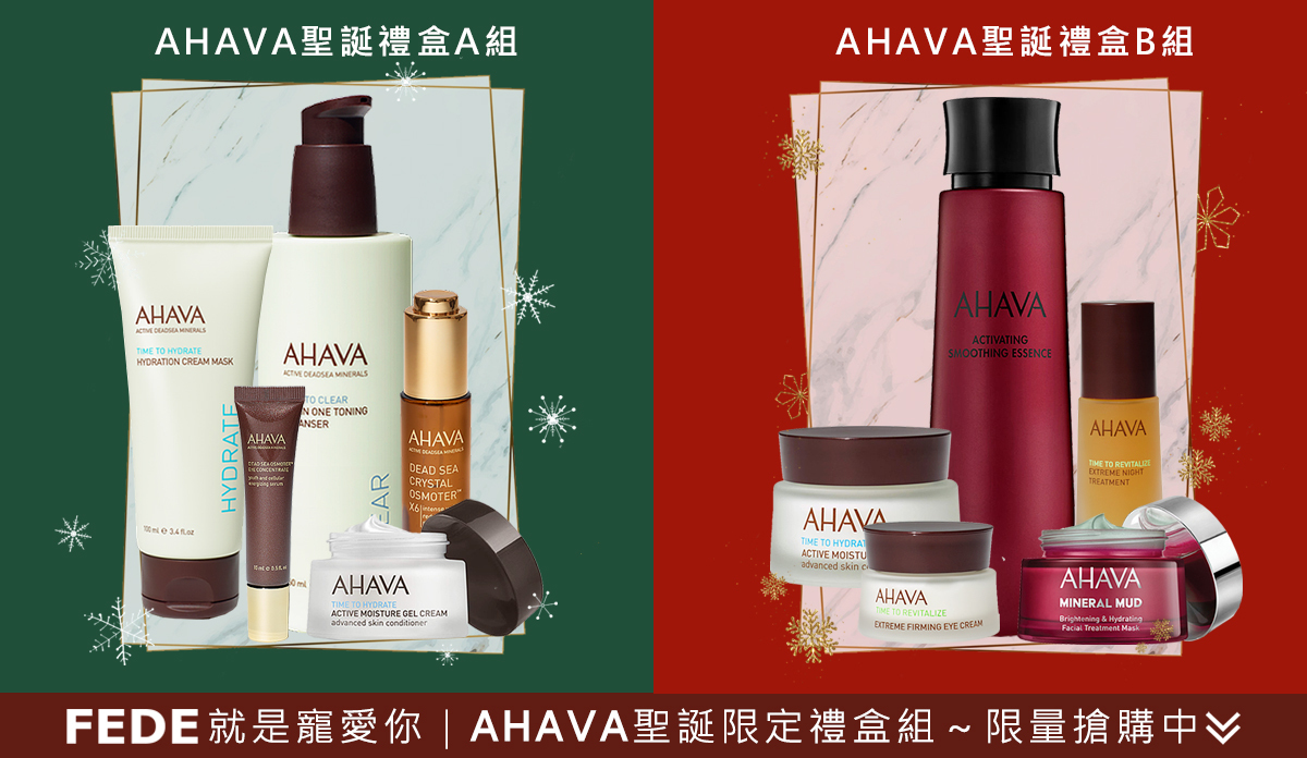 AHAVA聖誕禮盒來了~最暢銷搶購商品組合!神力女超人蓋兒加朵最愛的品牌,AHAVA獨家專利Osmoter™ + 四大核心元素,給你最極致的逆齡美肌!從基礎保養、卸妝、面膜、乳霜、眼霜及精華液,AHAVA熱銷明星商品一次滿足你的慾望清單,聖誕跨年派對就是要美美的,讓肌膚綻放迷人光彩!