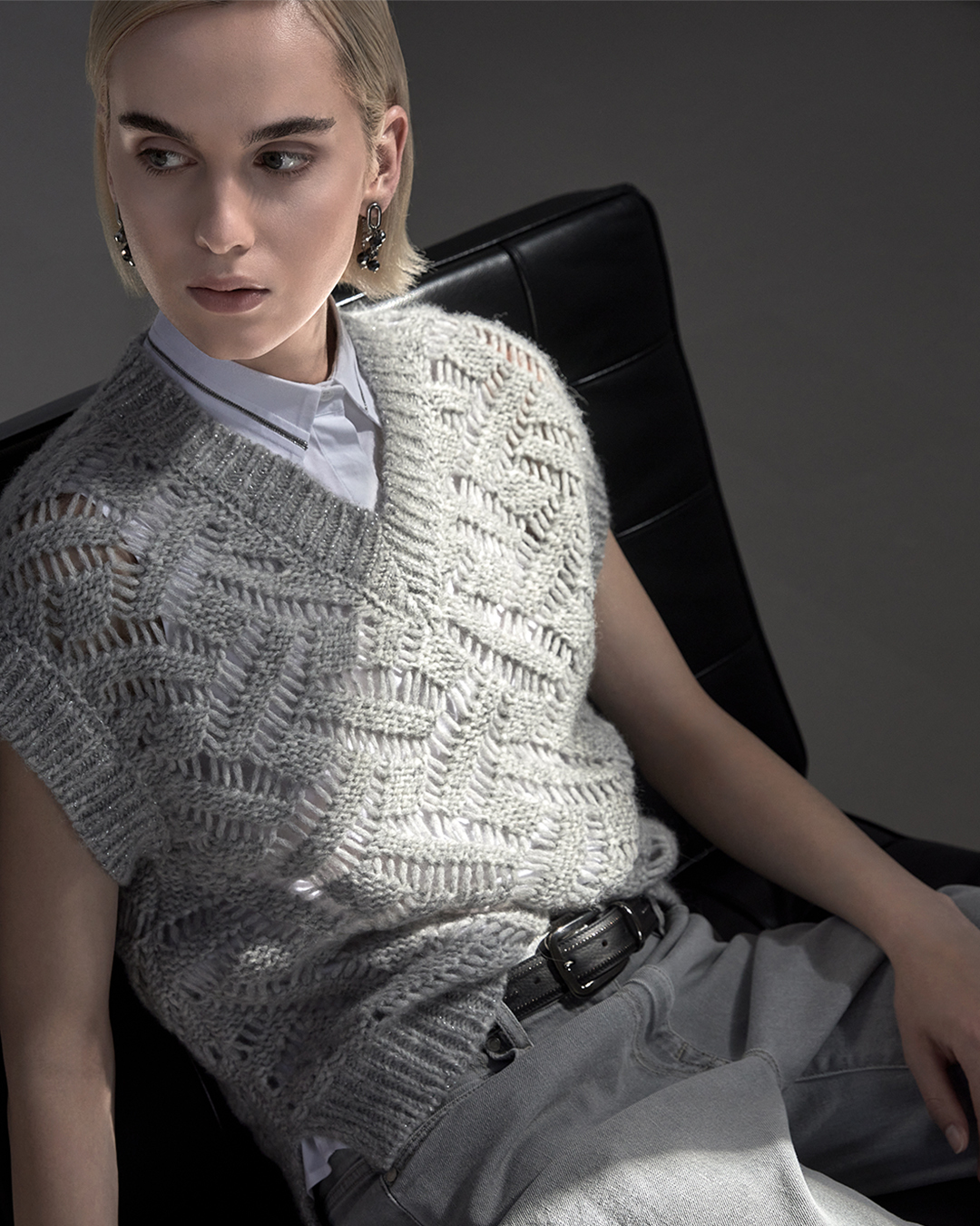 山峰的純白、炙熱的黃昏光輝、冰川飛瀑,以及高海拔夜晚的絲滑光芒—女性身影被珍貴的面料包裹,服裝的線條彷彿由冰雕刻而成,自然地和諧於輕盈與溫暖之間。