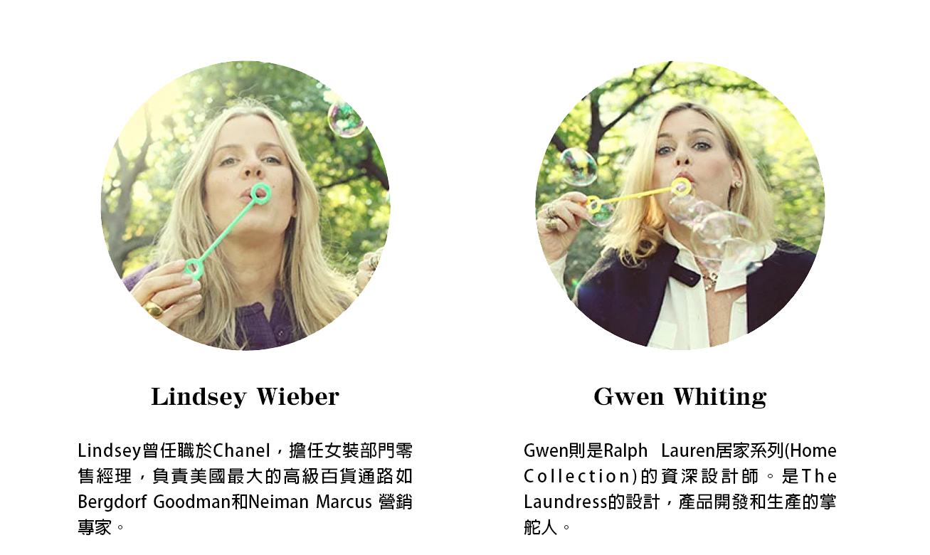 品牌創辦人 Lindsey 曾任職於CHANEL 香奈爾,Gwen 則是 Ralph Lauren 的資深設計師。 為了不讓乾洗店使用的化學成分傷害自己寶貴的衣物,他們決定創辦 THE LAUNDRESS® 結合時尚與環保概念,完善保存與維護衣物與居家環境清潔。